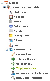 For at tilføje en nyhed skal du under din forening vælge ”Administration” og herefter ”Tilføj nyheder”.