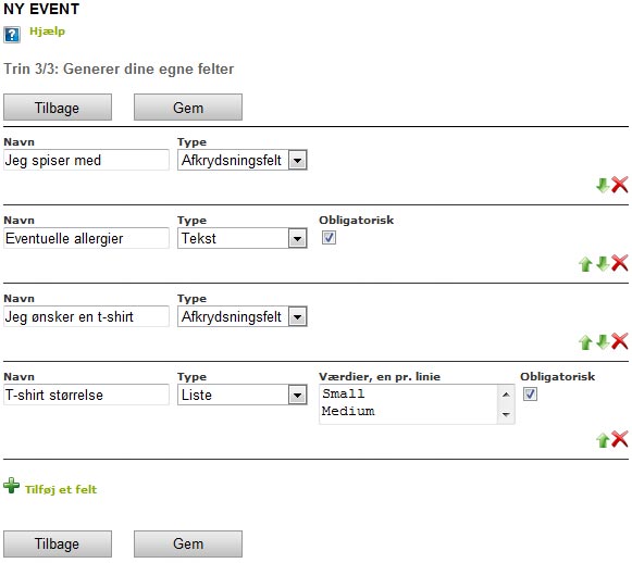 På sidste trin har du mulighed for at lave flere felter til eventen som dem der tilmelder sig skal udfylde ved at klikke "+ Tilføj et felt". Det kunne fx. være "Deltager du i fællestransport" eller "Hvilken størrelse t-shirt ønsker du". Der kan laves lige så mange felter der ønsker og der er mulighed for flere typer.