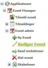 I menuen til venstre skal du klikke på menupunktet "Applikationer", "Event Manager", derefter "Event admin" og "Rediger Event":
