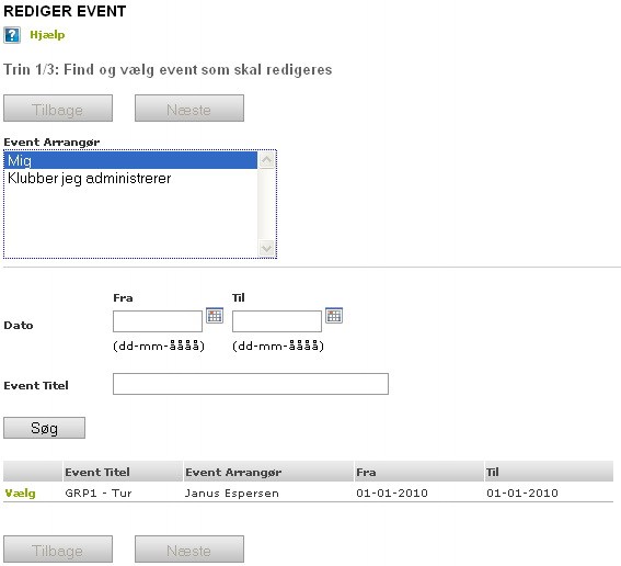 Klik på "Vælg" ud for den event, du ønsker at redigere.