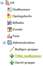 Hvis du ikke har menupunktet ”Administration” under gruppen, er det fordi, at du ikke er administrator for din forening. Her skal du kontakte den person, der står som administrator for din forening og bede ham/hende om at tilføje dig som administrator. Du finder gruppens administratorer ved at klikke på gruppens navn (på ovenstående billede klikker du på ”U9”).