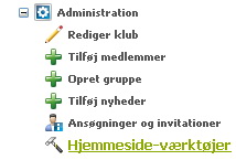 For at finde koden der skal indsættes på hjemmesiden, skal du ind under din forening , dernæst "Administration" og vælge "Hjemmeside værktøjer".