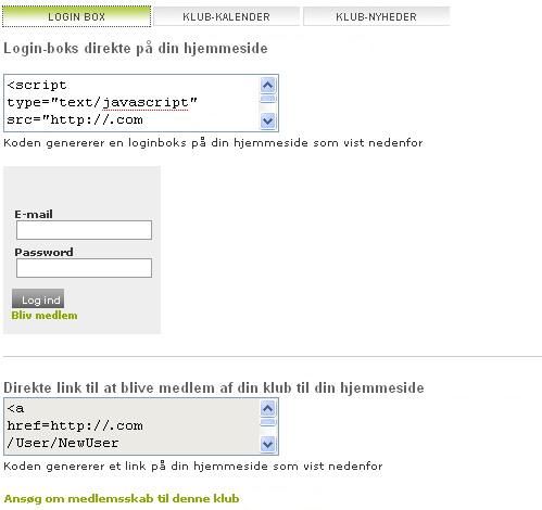 Ved at indsætte det første felt med kode på din hjemmeside, vil der vises en login box på hjemmesiden, således at medlemmer nemt kan logge ind på Foreningsweb.dk direkte.
