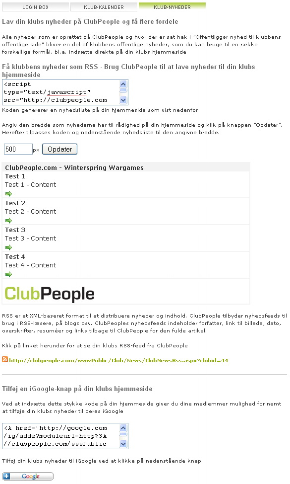 Nederst på siden findes koden til et iGoogle link, så ledes at medlemmer nemt kan tilføje nyhederne fra deres forening til deres iGoogle.